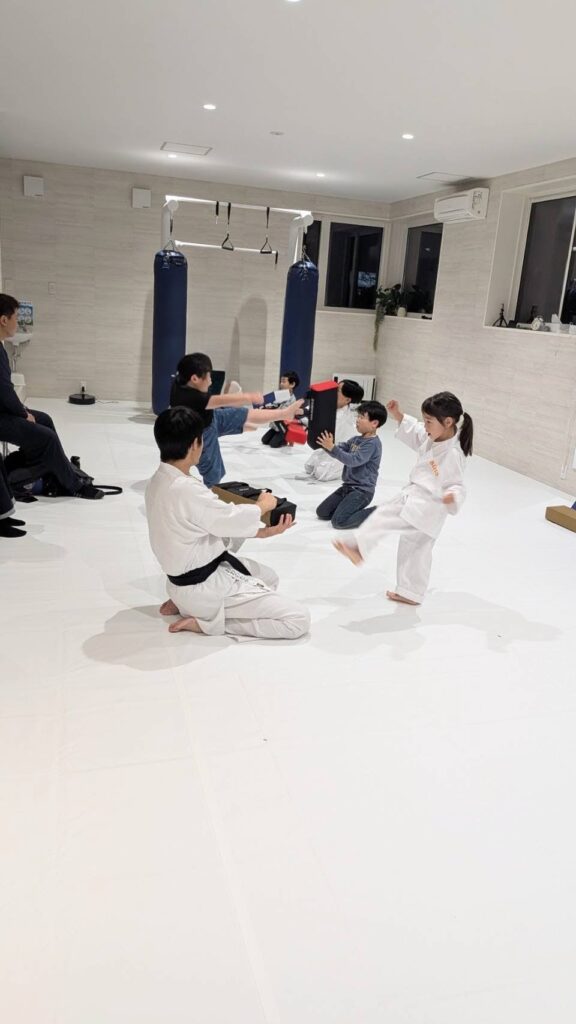キッズ空手ではミットを並べて高く蹴る練習をして、ミットにキックしてみました。