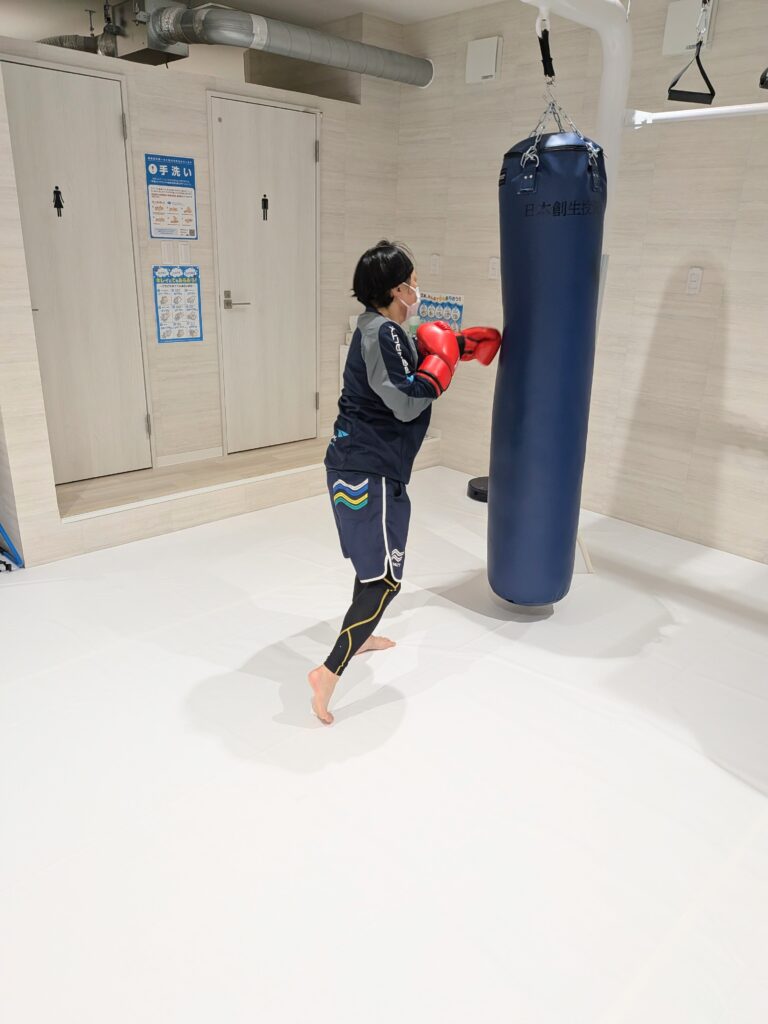 キックボクシングビギナークラスでは基本の打ち方、蹴り方。重心をしっかり軸足に乗せる意識を持ってもらうやり方を行いました。