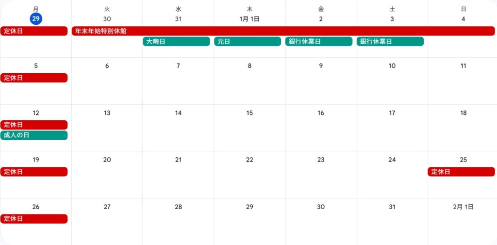 定休日:毎週月曜1/5,12,19,26 最終日曜日1/25