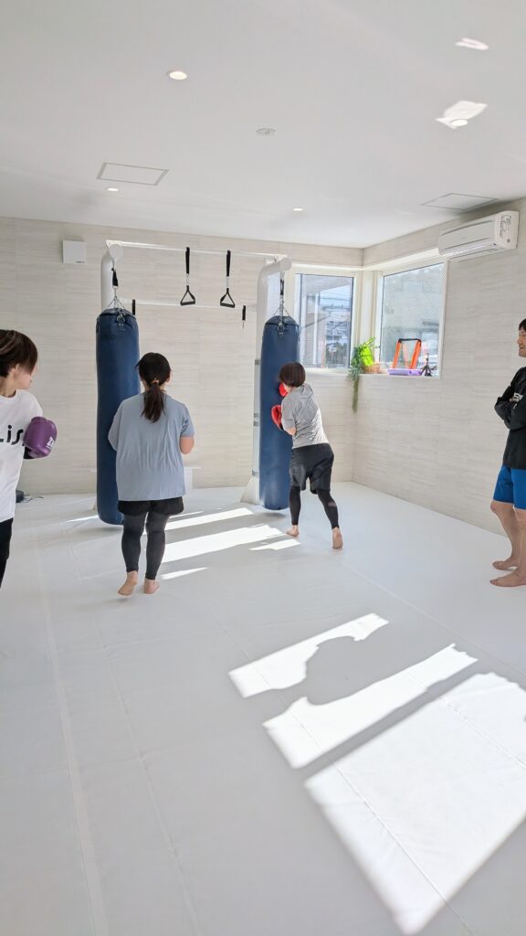 キックボクシングレディースクラスではラダーを使ったウォーミングアップ、サンドバッグ打ち、ミット、筋トレをやりました!